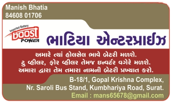Manufacturer of Bike battery, Inverter battery and all types of Battery offered by Bhatia Enterprise from Surat, Gujarat, India For more details please contact us on 8460801706 / 9724359775