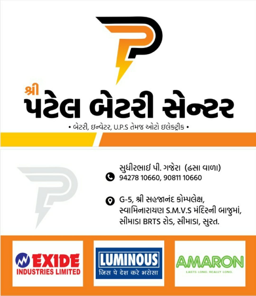 Shree Patel Battery Center dealing all types of Automobile and Inverter Batteries also have done Auto Electric works. For more details please contact us on 9427810660