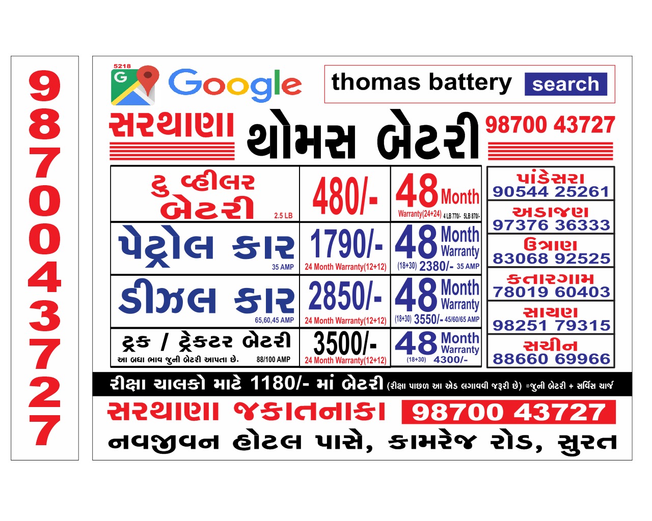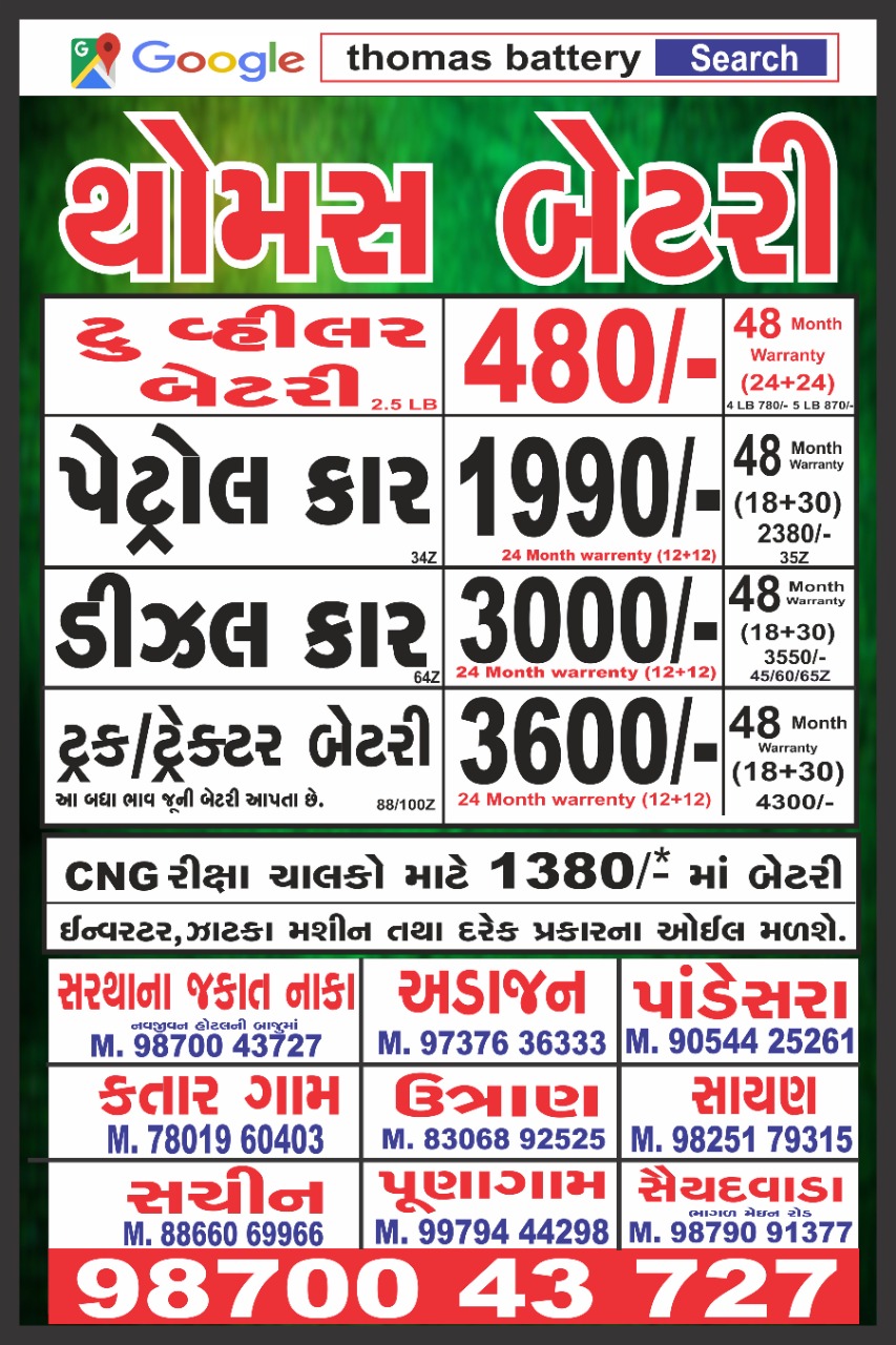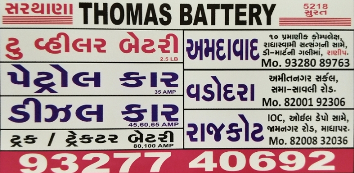 THOMAS BATTERY We are leader in Manufacturing of All Types of Batteries like Two Wheeler, Four Wheeler, Truck, Auto Rickshaw, Tractor, UPS Battery, Solar Inverter Battery and many more Batteries Available in our Nearest Dealership or Retail Outlet. For Attractive Offers and Best deal for Battery please Contact us on 9327740692 or Search on Google